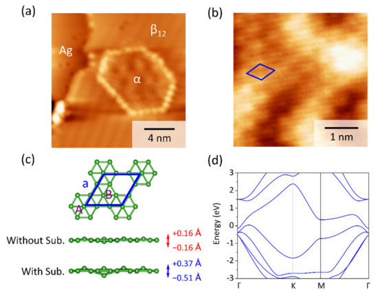 - Wu, R.; Drozdov, I.K.; Eltinge, S.; Zahl, P.; Ismail-Beigi, S.; Bozovic, I.; Gozar, A. Large-Area single-crystal sheets of borophene on Cu(111) surfaces. Nat. Nanotechnol. 2019, 14, 44–49. [Google Scholar] [CrossRef] [PubMed]