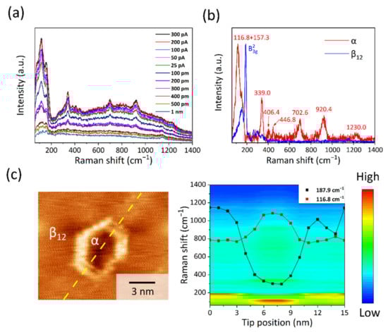 (a) Gap distance-dependent TERS spectra of α borophene (10 mW, 0.3 V, the accumulation time for each spectrum is 50 s). The tip-sample distance was controlled by first decreasing the tunneling current from 300 pA to 25 pA, and then the tip was retracted from the surface in 100 pm steps with the feedback loop off. (b) Comparison of the TERS spectra of α and β12 phases after background subtraction and normalization. (c) TERS spectra were taken along the yellow line, crossing the α borophene domain. The Raman intensity map was plotted in the right panel, where two dotted lines are the TERS intensity profiles of the two characteristic peaks of α borophene (red) and β12 borophene (black), respectively.
