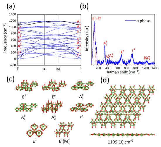 Finally, the TERS peak located at 1230 cm−1 is about 90 cm−1 above the highest phonon mode at Γ in the phonon spectrum. To account for this peak, we attribute it to a vibration mode of a supercell. Here, a 4 × 4 × 1 supercell is considered because the periodicity of Moiré pattern of the α phase is about four times that of unit cell. Due to the Brillouin zone folding, the M point of the unit cell will be folded to the Γ point in the new Brillouin zone of the 4 × 4 × 1 supercell. The mode at the M point contributes to a supercell vibrational mode with a frequency of 1199.10 cm−1 (Figure 3d), which matches our measurement better than any other modes contained in such a supercell. In addition to the frequency consistency, this mode also contains the out-of-plane vibration component. Therefore, it very likely corresponds to the 1230 cm−1 TERS peak.