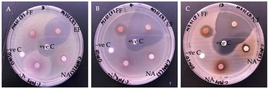 Images of the inhibitory test by disc diffusion with ethyl acetate G. boninense SPE extract: (A) S. pyogenes; (B) CoNS; (C) MRSA. All the agar plates included with Chloramphenicol (30 μg/disc) were used as positive control and 10% DMSO as negative control. Labels: flush fraction (FF); elute fraction (EF); not applicable (NA); positive control (+ve C); negative control (−ve C).