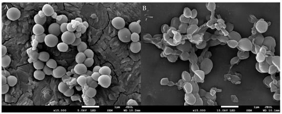 Images of the scanning electron microscope of MRSA before and after treatment with ethyl acetate G. boninense SPE elute fraction (EF): (A) control group of MRSA with 10% DMSO; (B) treatment group of MRSA with 1× MIC of EF. Both were incubated for 12 h at 37 °C.
