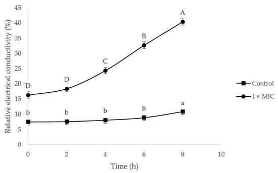 The effect of 1× MIC of EF on bacterial cell membrane permeability was examined by measuring their relative electrical conductivity, and the result is illustrated in Figure 4. Results show the extract responded time-dependent effect as the relative electrical conductivity for MRSA was increased timely. The electrical conductivity was increased in the 8 h of treatment, ranging from 16.30 ± 1.21% to 40.39 ± 1.02%. In contrast, the control group only showed a slight increase from 7.51 ± 0.70% to 10.89 ± 0.20%. A significant increase of electrical conductivity (p < 0.05) in the control group can be observed only after 6 h of incubation. This might be due to normal lysis or natural death of bacterial cells. On the other hand, high relative electrical conductivity in the treatment group indicated leakage of electrolytes from the cell membrane and revealed the disruption in cell membrane permeability. The alteration of cell membrane permeability has interrupted the membrane’s barrier that allows passage of necessary ions and electrolytes for normal regulation of cell metabolism [71]. The mechanism of action in penetrating and altering the cell membrane of MRSA by furanone derivatives has been reported in detail [72].