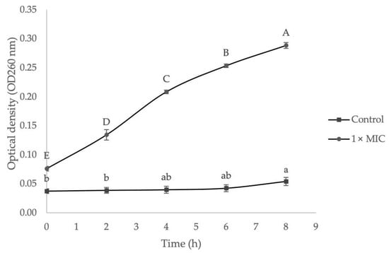 The effect of EF on bacteria cell membrane integrity was investigated by measuring the absorbance value of 260 nm absorbing materials, which were released from the intracellular membrane after bacteria cells were exposed to 1× MIC of extract. As presented in Figure 5, the absorbance values at 260 nm treated with 1× MIC of extract were increased significantly for MRSA, ranging from 0.076 ± 0.004 nm to 0.288 ± 0.005 nm after 8 h of treatment. In contrast, the 260 nm absorbance values of the control group showed only a slight increase, ranging from 0.037 ± 0.004 nm to 0.054 ± 0.007 nm, which significant increase (p < 0.05) was only observed after 4 h and 6 h. This situation could be due to the normal lysis and cells death over time. In this study, the cell membrane integrity was expressed by recording the absorbance value of 260 nm since genetic materials such as nucleic acids, RNA, or DNA have a maximum UV absorption peak at 260 nm. A higher 260 nm absorbance value in supernatant indicates higher nucleic acid content was released from cells. Based on the result, MRSA showed a significant increase of 260 nm absorbance value after being treated with 1× MIC of G. boninense SPE extract and confirmed the release of intracellular genetic materials that resided in the interior membranes to the outer solution. The leakage of these important materials reveals irreversible damage to the membrane integrity and causes cellular malfunction and further cell death [73].