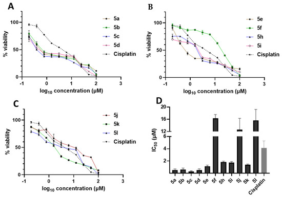 Figure 3. Anti-proliferative activity of thiazolidines 5af and 5hl; (AC) cell viability of MCF7 cell incubated with thiazolidine and tested by MTT assay after 96 h. (D) calculated IC50 based on non-linear data obtained from the cell viability study.