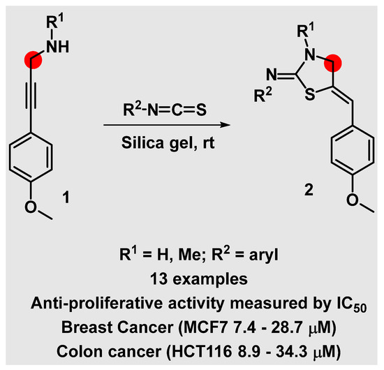 A previously reported on-surface synthesis has been developed for thiazolidinones but it requires long reaction times and dichloromethane as solvent [35]. While, in our earlier work, silica gel was investigated and shown to promote fast cyclization of thioureas formed in situ from propargyl amines and isothiocyanates. Therefore, we have focused on developing this interesting one-pot chemistry further to access bio-active thiazolidine-based structures easily [36]. In 2019, our group published the synthesis of a novel group of thiazolidines using this procedure, some of which were prone to oxidation at C4 upon extended exposure to the ambient atmosphere producing thiazolidinones (Scheme 1) [13]. Most of the reported compounds showed good anti-tumor activity against colon and breast cancers (in vitro study using HCT116 and MCF7 cell lines), which inspired us to design new analogs belonging to thiazolidines system only. Therefore, in this present study, an efficient, fast, and convenient on-surface methodology is explored toward synthesis of 5-substituted thiazolidines in a one-pot reaction from propargyl amines and isothiocyanates. Since our previously prepared thiazolidines were more active against breast cancer in general, the anti-proliferative activity of the current new analogues against a breast cancer cell line (MCF7) is also described.
