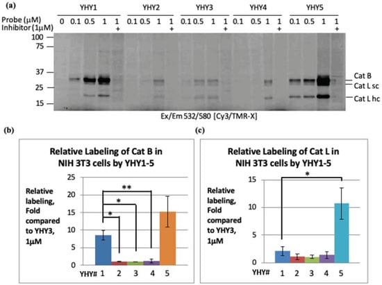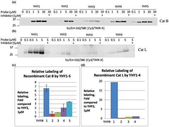 Affinity of YHY probes toward Cat B and L. Labeling of recombinant cathepsin B with YHY probes was conducted twice. Recombinant Cathepsin B was incubated with increasing concentrations of probes YHY1–5. Samples were analyzed by SDS-PAGE, and BODIPY-TMR-X fluorescence was measured by scanning the gel with a Typhoon scanner (a). Labeling of recombinant cathepsin L (b) was performed similarly to as described in (a). Cathepsin B and L bands’ intensity received for each probe was quantified by Image J, relative to YHY3 determined as 1. Probe concentration quantified in (c,d) was 1 µM. YHY# refers to YHY number.