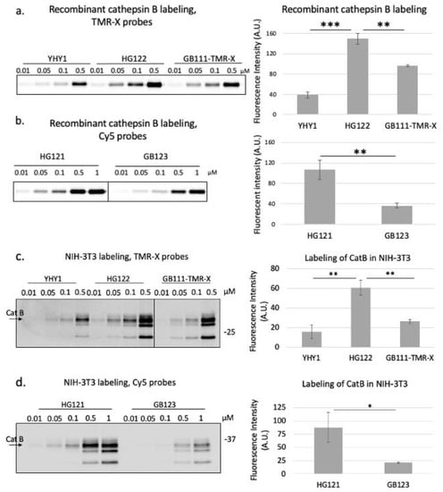 Labeling recombinant cathepsin B and endogenous cathepsin activity in intact NIH-3T3 cell. Labeling of recombinant cathepsin B as described in Figure 1 seen in (a). Quantification of the band intensity of 0.1 µM probe (of 3 technical repeats) is presented on the right; TMR-X labeled probes were scanned at 532/570 nm. Cy5 labeled probes, scanned at 630/670 nm, (b). Monolayers of NIH-3T3 cells were treated with indicated probes for 24 h at 37 °C and then lysed with RIPA buffer. Equal protein amounts were resolved by SDS PAGE that was scanned with a Typhoon scanner. Scans for TMR-X in (c) and of Cy5 in (d). Cathepsin B band is marked by an arrow. Bars represent mean ± SD, * p ≤ 0.05, ** p ≤ 0.01, *** p ≤ 0.0001. Samples in each panel were cropped from the same gel.