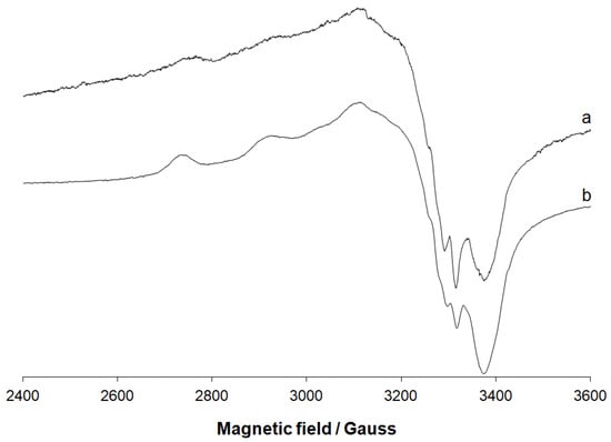 The EPR spectra of the solid complex CuHABH (or [CuLH2(OAc)]) were recorded on the polycrystalline powder at 298 K (room temperature, RT) and 77 K (liquid nitrogen temperature, LNT) and after dissolving the compound in DMSO and DMF at 77 K. The spectra, reported in Figure 2, were countersigned by a tetragonal signal. The resolution improved with decreasing the temperature, and at LNT (liquid nitrogen temperature) the hyperfine coupling between the unpaired electron and the 63,65Cu nucleus clearly emerges (Figure 2b).