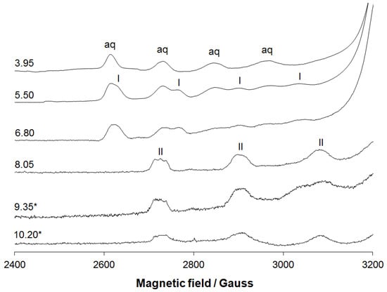 Low field region of the X-band anisotropic EPR spectra recorded at 77 K as a function of pH in an aqueous solution containing 63CuSO4·5H2O and HABH (LH3) with a molar ratio of 1:1 and Cu(II) concentration of 1.0 × 10–3 M. The values of pH are shown for each spectrum. The asterisk indicates that at pH 9.35 and 10.20 the solution was opalescent for the presence of the solid compound. With aq, I and II the first parallel resonances of aquation, and of the complexes with coordination (imine-N, CO) and (O−, imine-N, CO) are denoted.