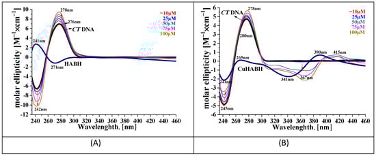 CD spectra of CT-DNA (100 µM) in the presence of: (A) HABH, and (B) CuHABH at 0–100 µM concentration. The red arrows indicate the direction of change/movement of the spectrum. The black arrows show the CT-DNA spectrum of DNA and its absorbance maximum. The numbers shown on the spectra refer to the absorbance maximum of the emerging bands.