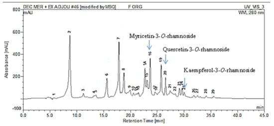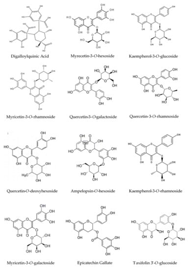 As figured in Table 3, our extract has a high level of flavonol glycosides. The ionization in the negative mode of myricetin-3-O-galactoside, myricetin-3-O-hexoside, myricetin-3-O-rhamnoside, and myricetin-O-galloyl-deoxyhexoside showed a signal at m/z 479, 479, 463, and 615, respectively. The similarity of the negative ion mass spectrum [M − H]− and the UV spectra of these molecules (Table 3) with those found by de Brito et al. [] and Saldanha et al. [] confirms their structures. Peaks 17, 20, and 21 were identified as quercetin-3-O-galactoside, quercetin-3-O-rhamnoside, and quercetin-O-deoxyhexoside, respectively by comparing our results with those reported by Pacifico et al. []. Peak 15 and 26 with [M − H]− (m/z) 447 and 431 were identified as kaempferol-3-O-glucoside and kaempferol-3-O-rhamnoside, respectively. The structure of the molecules identified by HPLC-MS were presented in Figure 2.