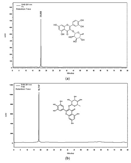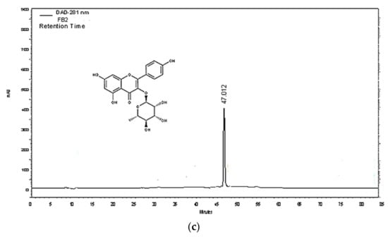 Chromatographic profile of (a) C fraction (Quercetin-3-O-rhamnoside), (b) M2 fraction (myricetin-3-O-rhamnoside), and (c) B2 fraction (kaempferol-3-O-rhamnoside) acquired by HPLC-DAD.