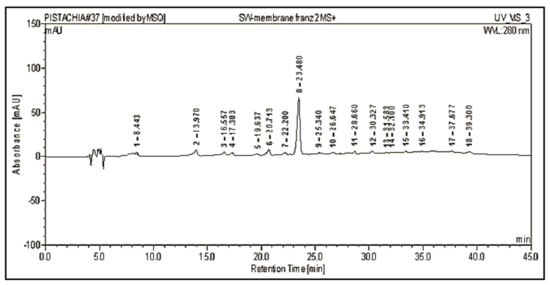 Chromatographic profile of the receptor medium of Franz cell after diffusion of 5% EAE-hydro-cream formulation through the start-M membrane, acquired by HPLC-MS at 280 nm. The peak assignments are listed in Table 3.