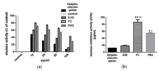 The elastase inhibition activity of EAE and its pure molecules FC and FM2 was evaluated at different concentrations ranging from 12 to 100 µg/mL. Results indicated that EAE has higher elastase inhibition activity compared to the pure molecules, and has a near activity compared to the standard Epigallocatechin gallate. As indicated in Figure 7a, the elastase activity decreases significantly in dose depending manner with EAE, FC, and FM2. At a concentration of 100 µg/mL, the percentages of elastase activity with EAE, FC, and FM2 were equal to 12%, 42%, and 29%, respectively. Besides, the percentage of elastase activity with Epigallocatechin gallate was 8%. The IC50 values of elastase activity of FC (86 µg/mL) and FM2 (45 µg/mL) were significantly higher compared to that of EAE (19 µg/mL) (p < 0.001). No significant difference was marked between IC50 values of EAE and Epigallocatechin gallate (12 µg/mL) (Figure 7b).