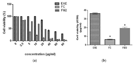 Cytotoxic effect of ethyl acetate extract (EAE), quercetin-3-O-rhamnoside (FC), and myricetin-3-O-rhamnoside (FM2) on B16 cells (a) at different concentrations and (b) their IC50 values. (Bars, ± SD (n = 3)), * significant p ˂ 0.0001 compared to EAE.