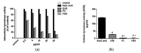 (a) Cellular tyrosinase activity (% of control) and (b) cellular tyrosinase inhibition activity (IC50) on B16 cells of ethyl acetate extract (EAE), quercetin-3-O-rhamnoside (FC), myricetin-3-O-rhamnoside (FM2), and kojic acid standard (Bars, ± SD (n = 3)). * Significant p ˂ 0.001 compared to EAE and # significant p ˂ 0.0001 compared to kojic acid.