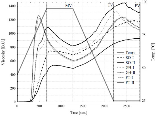 The results of the pasting properties of 5% potato starch suspensions in water are presented in Table 4 and Figure 1. From observing the pasting curves, it can be concluded that three distinctive courses can be observed for the starches grown in different conditions (GH, FT and SO), with the largest discrepancies observed between the cultivation year for the SO starches. The pasting temperatures (PTs) of all the investigated PS was within a rather narrow range, 69.5–72.1 °C, which are in the range reported in the literature [63,64] and also similar for oat starches [65].