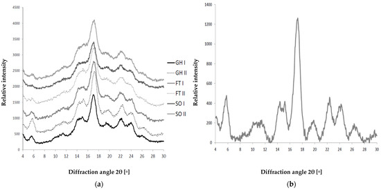 The crystallinity of starch granules can reveal important information about the internal structure and the type of amylose chains distribution within the granules. There are two distinct crystalline polymorphic forms: the A-type (B2 space group) [72], mostly found in cereal starches, and the B-type (P61 space group) [73,74], observed in tuber starches (PS is in that group) and high-amylose cereal starches. As starch is composed from mostly amorphous amylose and semicrystalline amylopectin, the powder XRD pattern consists of amorphous part and crystalline peaks (compare Figures 1 and 3 in [75]). In our case, the XRD patterns of the analyzed starches are presented in Figure 2a. As can be seen from Figure 2a, in all the cases, the shape of the curves is similar. The crystalline diffraction peaks can be seen in all the cases, and the best patterns are observed for GH I and GH II starches. Figure 2b shows the XRD pattern for GH II after data processing (background and amorphic part subtraction). In Figure 2b, one can recognize crystalline peaks, the most important are 5.74, 10.10–11.74, 14.38, 15.18, 17.26, 19.86, 22.40, 24.22 and 26.36°. Most of them indicate a B-type structure, but a peak at 22.40° could also indicate some fraction of the C-type [75,76]. The relative crystallinity of the samples was calculated by comparing the crystalline area with total area of the peaks in the 2θ range 4–30°, using the Equation (2) from the paper of Frost and co-workers [77]. The results are summarized in Table 6. As can be seen from the table, the highest values are found for the starches obtained from the potatoes cultivated in a greenhouse (GH I and II), which is consistent with the highest amylose content (compare Table 1). The other samples have a significantly lower crystallinity.