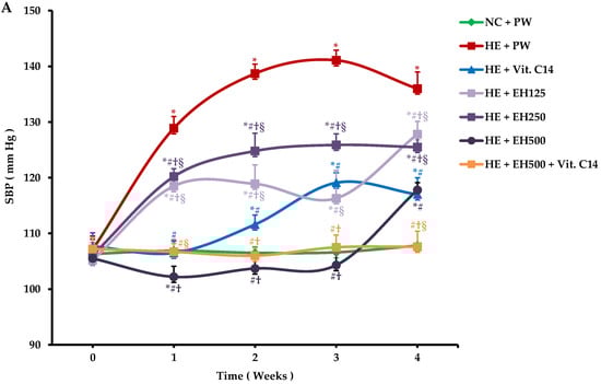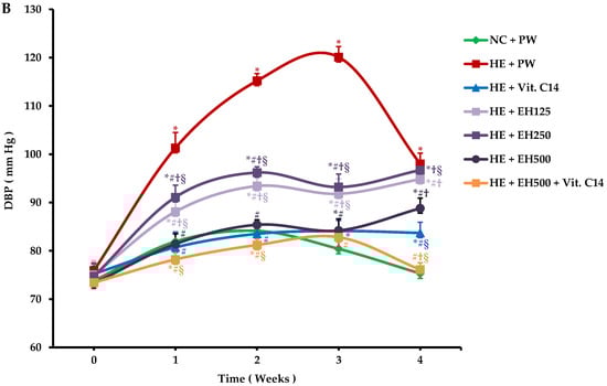 Antihypertensive effect of extract of hawthorn and vitamin C on systolic blood pressure (A) and diastolic blood pressure (B) during extract of hawthorn and vitamin C administration for 4 weeks. Systolic blood pressure (SBP); diastolic blood pressure (DBP); normal temperature control (NC); heat exposure (HE); purified water (PW); vitamin C (Vit. C); extract of hawthorn (EH). Values are expressed as means ± standard deviation (n = 6/group). * indicates p < 0.05 vs. NC + PW; # indicates p < 0.05 vs. HE + PW; † indicates p < 0.05 vs. HE + Vit. C; § indicates p < 0.05 vs. HE + EH500.