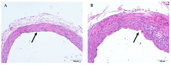 Vascular tissue samples were homogenized in ice-cold normal saline (10 volumes for the vasculature) with a Teflon homogenizer. The homogenates were centrifuged at 12,000× g for 5 min in a centrifuge (5804R, Eppendorf, Hamburg, Germany) at 4 °C. The supernatant was removed and stored at −80 °C for analysis. The thoracic aorta tissues were collected in 10% neutral formalin saline buffer for proper fixation for 24 h. These tissues were processed and embedded in paraffin wax. Sections of 5–6 μm in thickness were made and stained with haematoxylin and eosin (H&E) for histopathological examination under an optical microscope (SteREO Discovery V20, Jena, Germany) [63].