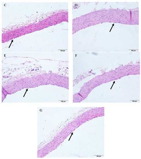 The vascular morphology of the arterial tissue and the histopathological changes in rats induced by heat exposure are shown in Figure 2. The histopathological morphology in the HE + PW group is shown in Figure 2B, which shows the thickening of the media layer of the artery wall missing smoothing of the endodermis, and the irregular arrangement of muscle cells apparently being seen. However, these were significantly prevented in rats supplemented with EH and/or Vit. C (Figure 2C–G). Interestingly, co-administration of EH of 500 mg/kg and Vit. C of 14 mg/kg shows the strongest effect (Figure 2G), and the single administration of EH of 500 mg/kg (Figure 2F) shows the closest results to the normal morphology of the NC + PW group (Figure 2A). However, the smooth edge of endodermis was lost but irregular cells were still observed in the single Vit. C and both HE + EH125 and HE + EH250 groups (Figure 2C–E).