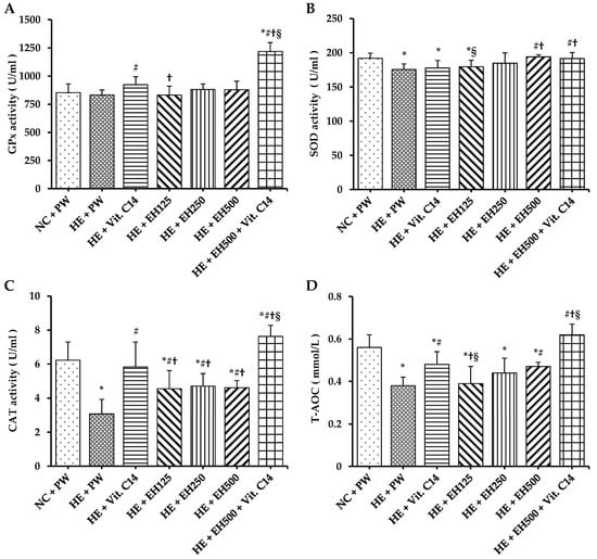 Effects of extract of hawthorn and vitamin C on serum GPx activity (A), SOD activity (B), catalase activity (C), and T-AOC (D) in all experimental groups. Glutathione peroxidase (GPx); superoxide dismutase (SOD); catalase (CAT); total antioxidant capacity (T-AOC); normal temperature control (NC); heat exposure (HE); purified water (PW); vitamin C (Vit. C); extract of hawthorn (EH). Values are expressed as means ± standard deviation (n = 6/group). * indicates p < 0.05 vs. NC + PW; # indicates p < 0.05 vs. HE + PW; † indicates p < 0.05 vs. HE + Vit. C; § indicates p < 0.05 vs. HE + EH500.