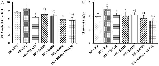 Effects of extract of hawthorn and vitamin C on serum MDA content (A), and vascular lipofuscin content (B) in all experimental groups. Malondialdehyde (MDA); lipofuscin (LF); normal temperature control (NC); heat exposure (HE); purified water (PW); vitamin C (Vit. C); extract of hawthorn (EH). Values are expressed as means ± standard deviation (n = 6/group). * indicates p < 0.05 vs. NC + PW; # indicates p < 0.05 vs. HE + PW; † indicates p < 0.05 vs. HE + Vit. C; § indicates p < 0.05 vs. HE + EH500.