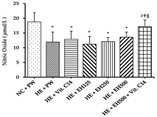 In this study, there was a significant reduction in serum nitric oxide levels in the HE + PW group compared with the NC + PW group (p < 0.01; Figure 5) while supplementation only combined with EH 500 mg/kg and Vit. C significantly increased (p < 0.05) to the normal level.