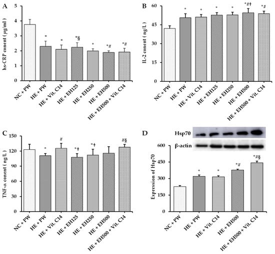 Interestingly, serum hs-CRP level was significantly reduced in all HE groups with or without EH or/and Vit. C supplementation compared with the NC group (all p < 0.001; Figure 6A), suggesting that hs-CRP, as a proinflammatory parameter, did not contribute to arterial wall damage in rats exposed to heat (Figure 2B). Furthermore, the level of serum IL-2 and the expression of heat shock protein 70 (Hsp70) (can protect cells from thermal or oxidative stress) in liver tissue were significantly increased in all HE groups with or without EH or/and Vit. C supplementation compared with the NC group (all p < 0.001; Figure 6B,D). However, supplementations with EH (500 mg/kg) alone or combined with Vit. C significantly decreased the level of serum hs-CRP in heat-exposed rats (both p < 0.05; Figure 6A). Moreover, these supplementations increased the level of IL-2 and expression of Hsp70 (all p < 0.05; Figure 6B), but these effects were not obvious in the Vit. C group, indicating that the anti-inflammatory effect of IL-2 and Hsp70 was due to the effect of EH. However, serum TNF-α level was significantly decreased in the HE + PW group compared with the NC + PW group (p < 0.05; Figure 6C); this level was significantly increased in both groups with Vit. C supplementation individually or combined with EH (both p < 0.05), indicating the anti-inflammatory effect of TNF-α is caused mainly by Vit. C action.
