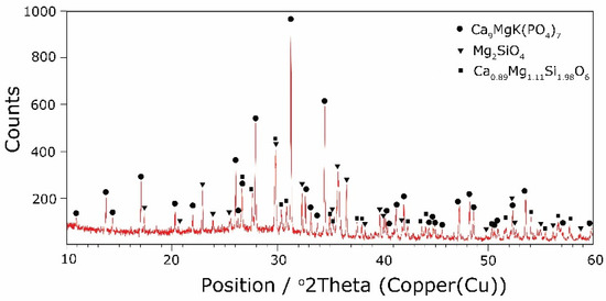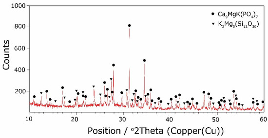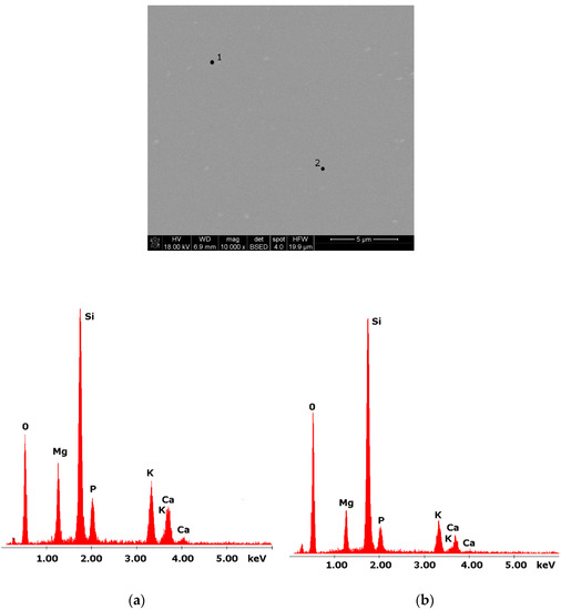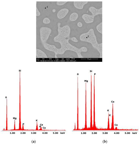Considering the above, it is worth mentioning that the results for the type of crystallization phase are in accordance with the results of SEM-EDS analysis (Figure 2 and Figure 3), which are mentioned in point 3.1. It is assumed that the observed phenomenon of liquation in the studied system affects the types of phases formed in the process of crystallization of their amorphous forms. On the basis of the SEM-EDS analysis, we found that the so-called phosphate phase was enriched with phosphorus, calcium, and magnesium (Figure 2b and Figure 3b), while the silicate phase contained increased amounts of silicon and potassium or silicon, magnesium, and potassium (Figure 1a,b, Figure 2a and Figure 3a). Taking this into account and comparing the type of crystallizing phases (Table 3), we can see a significant convergence for the results obtained.