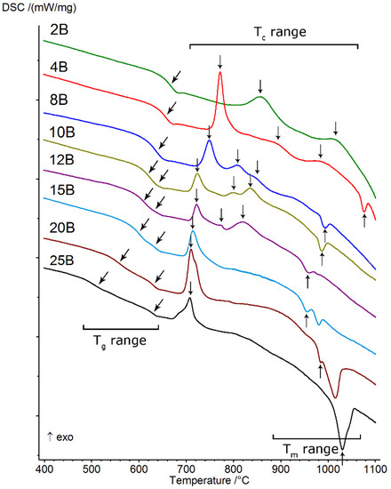 The starting point for all of the presented studies was differential scanning calorimetry (DSC), which allowed us to observe transitions typical for the vitreous state, such as the glass transition (Tg range), crystallization (Tc range), and melting (Tm range). All obtained thermal curves are presented in Figure 4, and the values of selected thermal parameters determined from them (Section 2.2) are presented in Table 2. The thermal investigations conducted allowed us to determine the effect of increasing the amount of B2O3 introduced to the glass composition while diminishing the amounts of MgO and CaO on glass stability, the ability to crystallize, and the course, as well as to identify the types of crystallizing phases. On the basis of the obtained DSC curves, it was found that all of the studied glasses showed the ability to undergo multistage crystallization, the character of which depended on the ratio (Table 1).