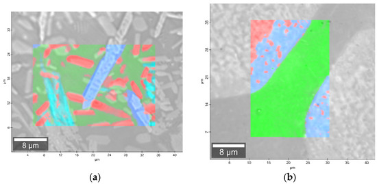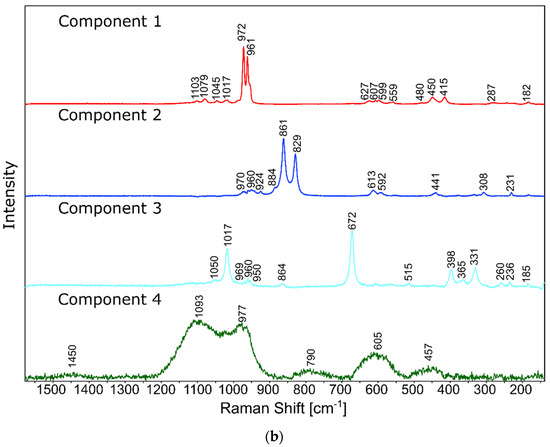 In the case of the 20B_710 devitrificate, the situation is slightly more complicated. In this case, the glassy matrix (Component 3), marked in Figure 10 with red, was also visible. In this case, similarly to 2B_1007, the observed bands corresponded to the presence of structural units typical for a silicate–phosphate matrix, as described in [19], which also confirmed the presence of boron ions in the glassy matrix. It was demonstrated, among others, the presence of atoms in both triangular (780–800, 147–01470 cm−1) and tetraedrical (760–770 cm−1) coordination as well as the formation of P–O–B (600–640, 1140–1150 cm−1) and B–O–Si (~480 cm−1) connections. At the same time, two further components of different structures—Component 1 (blue) and Component 2 (green)—were identified. Based on the Raman spectra obtained (Figure 10), Component 1 (blue) was identified as a phase with a complex phosphate Ca9MgK(PO4)7-whitlockite structure type. Unfortunately, the amount of published data on the Raman spectra of mineral phosphates is still limited, and we could not find a standard Raman spectrum for the phosphate Mg3Ca3(PO4)4-stanfieldite type. However, taking into account our detailed and systematic XRD analysis of the series of devitrificates with a gradually changing chemical composition formed on the basis of glasses from the SiO2–B2O3–P2O5–K2O–MgO–CaO system, it seems to be a reasonable proposal that Component’s 2 Raman spectrum (green), presented in Figure 10, comes from the phosphate Mg3Ca3(PO4)4-stanfieldite type. Considering phosphate [26,27,28,29], it seems very likely that the green Raman spectra of phosphate oxyanions shows a symmetric stretching mode (ν1) at about 992 and 963 cm−1, the antisymmetric stretching mode (ν3) at about 1012 and 1031 cm−1, and the symmetric bending mode (ν4) at about 625 and 584 cm−1, while bands at about 470 to 398 cm−1 could be assigned to the ν2 bending mode.