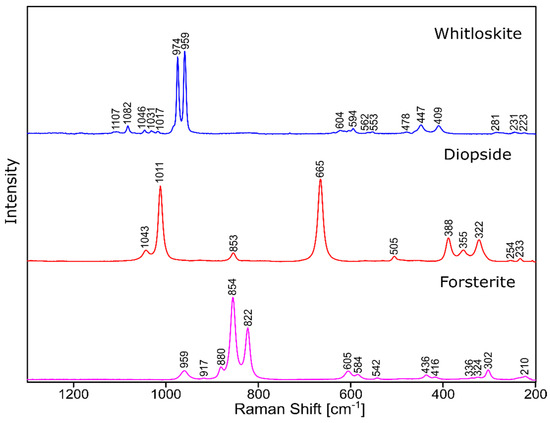 The phase identification results (XRD analysis) were correlated with RSI (Raman spectroscopy imaging) studies. This method gave us the opportunity to generate detailed chemical images based on the Raman spectra of the sample (Figure 8, Figure 9, Figure 10 and Figure 11). Two devitrificates, nos. 2B_1007 and 20B_710, were selected for the above analysis. They differed significantly in B2O3 content (Table 1) and phase crystallization type (Table 3). The Raman images obtained are presented in Figure 8, while the collected data from the designated areas are presented in Figure 9 for sample 2B_1007 and Figure 10 for sample 20B_710. Taking into account the information obtained from XRD studies, the identification process for the obtained spectra was related to the Raman spectra of standard substances. These spectra are presented in Figure 11 and they correspond to phosphate Ca9MgK(PO4)7 and two silicates: Mg2SiO4-forsterite type and CaMgSi2O6-diopside type.