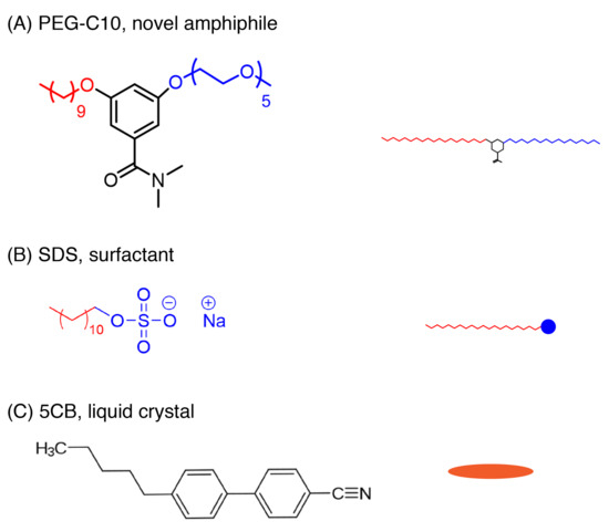 Molecular structures used in this study. (A) The oligomeric amphiphilic molecule, called O1 or PEG-C10. The novel functional group (shown in red), a polyethylene glycol C-10 group, is attached to the benzene ring. (B) Sodium dodecyl sulfate (SDS). (C) Liquid crystal molecule used 4-cyano-4-pentylbiphenyl (5CB). For all images, the hydrophobic groups are shown in red and hydrophilic groups are shown in blue. The small cartoon on the right is the version used in illustrations.