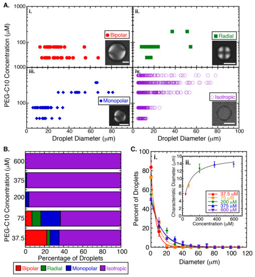 The fraction of droplets that are in the isotropic phase is notably high for all PEG-C10 concentrations examined (Figure 2A,B). At the three highest concentrations, almost 100% of the droplets are in the isotropic phase, independent of the size of the droplet (Figure 2A). For the lower PEG-C10 concentrations, the smaller droplets are more likely to be isotropic than larger droplets (Figure 2A). We created normalized histograms of the diameters of isotropic droplets (Figure 2C(i)). All histograms appear to decay exponentially, likely due to the agitation method we use to the create droplets. We fit the data to an exponential decay function of the form: = A to determine the characteristic diameter size, of the isotropic droplets (Figure 2C(i), fit data given in Appendix B.1: Table A2).