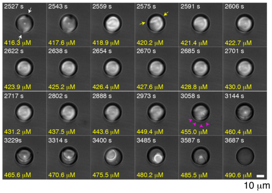 Each droplet begins in the bipolar configuration with two poles on opposite sides (i.e., Figure 4, 2527 s, 416.3 μM, white arrows). This is the configuration expected with little surfactant on the surface—just enough to keep the droplets from coalescing. As the concentration increases, one of the two bipolar defects becomes a traveling ring defect (Figure 4, 2575 s, 420.2 μM, yellow arrows). In our prior work, a traveling ring defect was predicted from simulations of liquid crystals in droplets. We used this optical trapping technique to directly observe the traveling ring defect when droplets transitioned from bipolar to radial configurations and compared this to theoretically predicted intermediate configurations [21].