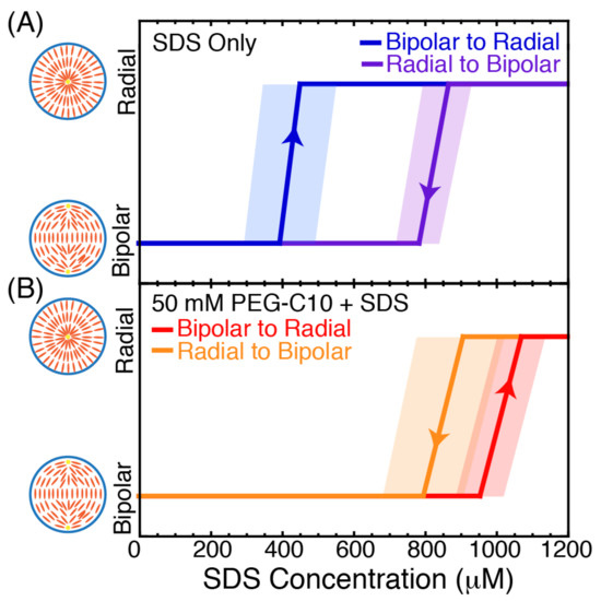 When we repeat the same experiment in the presence of 50 μM PEG-C10, we see a very different response. Both the transition concentrations are increased compared to SDS alone, occurring at 1000 ± 70 μM for the transition from bipolar to radial and 900 ± 100 μM for the transition from radial to bipolar (Figure 7B). The other noticeable difference is that the transition concentrations are reversed compared to the SDS only case. Specifically, more SDS must be added to become radial and more must be removed to revert back to bipolar. Thus, there is still hysteresis in the configuration change, but the difference is smaller and the opposite sign compared to SDS alone. We conjecture that this difference may be due to the PEG-C10 entering the droplet and making the transition harder for the surface SDS to trigger. Future modeling work may reveal that the existence of the PEG-C10 in the interior of the droplet, which presumably prefers the isotropic phase, is fighting the SDS for orientation of the liquid crystal. Increasing the PEG-C10 would likely overwhelm the SDS and cause the droplet to become isotropic.