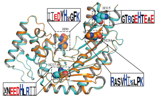 - Rao, Z.; Kim, S.Y.; Li, X.; Kim, D.S.; Kim, Y.J.; Park, J.H. Insight into Structural Aspects of Histidine 284 of Daphnia magna Arginine Kinase. Mol. Cells 2020, 43, 784–792. [Google Scholar] [CrossRef]