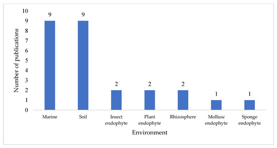 Number of publications for each of the isolation environments of secondary-metabolite-producing Streptomyces strains reported in 2020. A further 6 publications did not specify the environmental source of the strain under study.