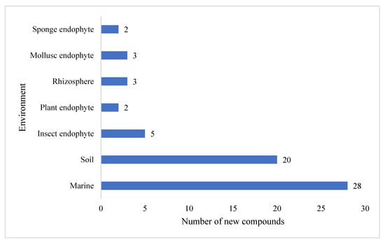 The environmental distribution of Streptomyces secondary metabolites isolated in 2020. A further 11 compounds originated from organisms of unspecified origin.