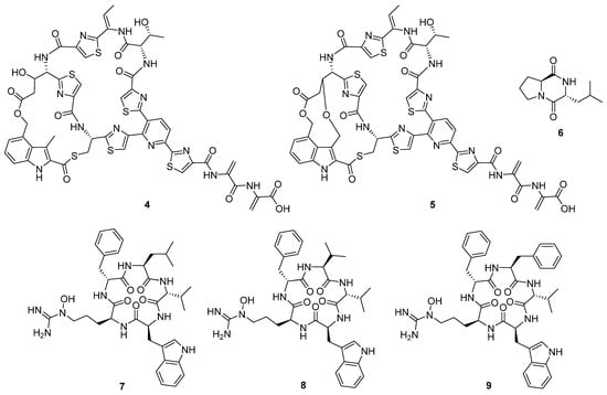 Cyclic peptides NOS-V1 (4), NOS-V2 (5), cyclo-l-leucyl-l-proline (6), and pentaminomycins C–E (7–9) [6,9,10].
