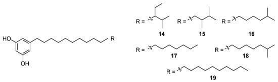 An HTS experiment looking for inhibitors of coenzyme A biosynthesis led to the isolation and spectroscopic characterisation of six new phenolic lipids, adipostatins E–J (14–19), from the marine-derived S. blancoensis (Figure 8) [17]. These novel compounds showed activity against both Gram-positive and Gram-negative bacteria: Enterococcus coli, E. faecalis, Bacillus subtilis, B. anthracis, Listeria monocytogenes, and Streptococcus pneumoniae. In contrast, the compounds had low to no effect on Staphylococcus aureus, Salmonella enterica, Shigella flexneri, or Klebsiella pneumoniae. The differential in vitro activity of adipostatins E–J suggests that the biological activity is mediated by the chain length and terminal branching.