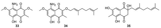 Three structurally related naphthoquinones were isolated from the marine-derived Streptomyces sp. B9173: flaviogeranins B1 (33), B (34), and D (35), the latter two of which are meroterpenoids (Figure 11). These compounds differ in their prenylation pattern and presence of amino and methyl groups on the hydroxynaphthoquinone core. Flaviogeranins B1 and B showed weak to moderate activity against S. aureus and M. smegmatis as well as human alveolar basal epithelial adenocarcinoma and human cervical cancer cells. In contrast, flaviogeranin D displayed stronger activity against S. aureus (MIC 9.2 μg mL−1) and M. smegmatis (MIC 5.2 μg mL−1), the alveolar basal epithelial adenocarcinoma (IC50 0.6 μg mL−1) and human cervical cancer cell lines in vitro (IC50 0.4 μg mL−1).