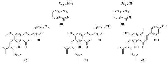 In total, eleven polyaromatic compounds were isolated from six Streptomyces species in 2020. Through herbicidal bioassay screenings, Kim et al. identified strong activity associated with Streptomyces strain KRA17-580 against the weed Digitaria ciliaris [29]. Two compounds were spectroscopically characterised, a cinnoline-4-carboxamide, 580-H1 (38), and a cinnoline-4-carboxylic acid, 580-H2 (39, Figure 13). In further phytotoxicity bioassays, the carboxamide proved to be less potent than the carboxylic acid, and electrolyte leakage assays were used to verify that the observed herbicidal activity was caused by destruction of the cell membrane [29].