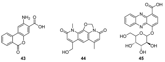 Structures of benzanthric acid (43), nybomycin (44), and 4-(3S,4R,5S)-3,4,5-trihydroxy-6-(hydroxymethyl) tetrahydro-2Hpyran-2-yloxy)phenazine-1-carboxylic acid (45) [31,32].