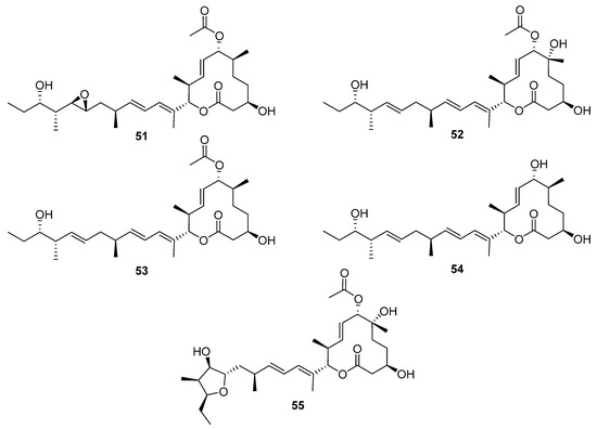 Macrocycle discoveries fall into two subgroups: macrolides (macrocyclic esters) and macrolactams (macrocyclic amides). Five macrolides (51–55, Figure 16) were identified while reactivating the quiescent pladienolide B biosynthetic pathway in a laboratory strain of S. platensis AS6200 [35]. Unsurprisingly, the laboratory strain showed high similarity (>95% nucleotide similarity with the published pld BGC [36]). One notable difference was that the PKS was encoded by five genes in AS6200, while the previously reported PKS was encoded by four genes [35,36]. The molecular structure of these compounds was deduced from spectroscopic data, and the compounds were tested in antibacterial, antifungal, antiprotozoal, and antiproliferation bioassays. The results indicated that all the congeners have less cytotoxic activity than the parent compound pladienolide B.