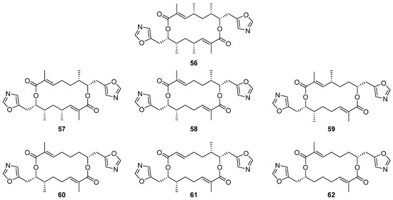 Six new analogues of oxazole-bearing macrodiolide conglobatin (56) were isolated from the previously unreported Australian Streptomyces strain MST-91080 (Figure 17) [37]. Conglobatins B–E (57–62) vary in the distribution of methyl groups around the macrocyclic core, proposed to arise via variable addition of methylmalonyl-CoA extender units during their biosynthesis. Three of the new conglobatins (B1 56, C1 57, and C2 58) displayed enhanced cytotoxicity against NS-1 myeloma cells, IC50 = 0.084, 1.05, and 0.45 µg mL−1 respectively, an increase in potency relative to the parent compound (IC50 = 1.39 µg mL−1).