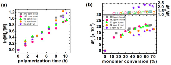 Polymerization of MMA varying concentrations of the catalytic complex: (a) first order kinetics plot of monomer conversion vs. polymerization time, and (b) Mn and Mw/Mn vs. monomer conversion (Table 1).