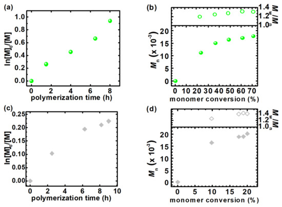 Linear plots of first order kinetics as a function of polymerization time (Figure 3a,c) and polymer growth with monomer conversion (Figure 3b,d) were observed. The results of the kinetic studies show the controlled polymerization of MMA and DMAEMA, resulting in a polymer product formed in solution with a low dispersity at each stage of polymerization (Mw/Mn = 1.31 and 1.41 for PMMA and PDMAEMA, respectively).
