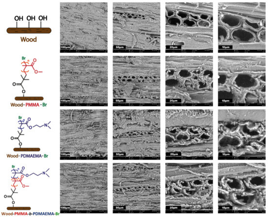 SEM images composed of unmodified wood, modified ash wood fibers wood-PMMA-Br (72 ppm by wt), wood-PDMAEMA-Br (45 ppm by wt), and wood-PMMA-b-PDMAEMA-Br captured with different magnifications (530×, 1400×, 4300×, 7800×).